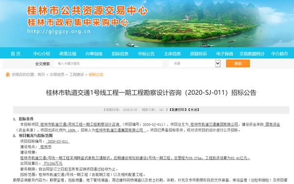 8月26日,桂林市公共资源交易中心发布桂林市轨道交通1号线一系列招标公告。