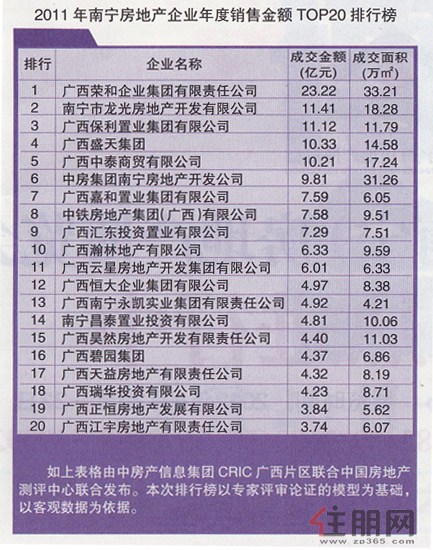 在三轮政策及行政表态重压之下,2011年的南宁市场商品房成交面积为465.91万㎡,前20名企业名下的商品房项目成交总面积为234.48万㎡,占总体市场成交面积的50.3%。