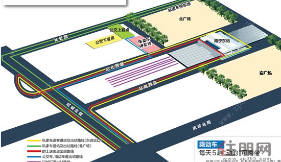 乘坐市内公交车进东站的旅客,从凤凰岭路驶入北广场。下车后,在北广场通过北进站口进入东站候车。同样的,旅客乘坐动车到南宁东站下车后,可到北广场公交停车场离开。
